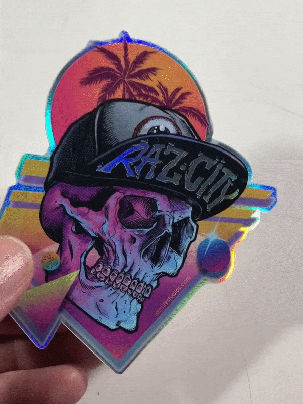 Full color sticker printed on a specialty holographic reflective paper.