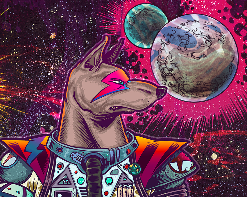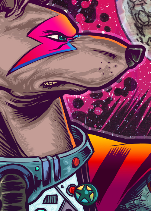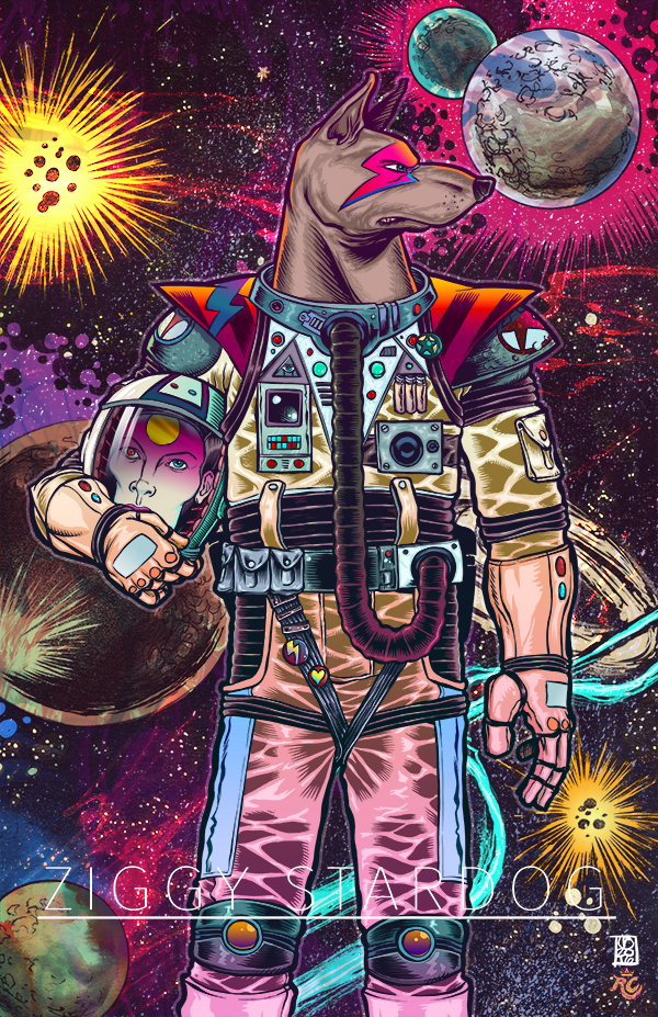 Print size is 18"x24". This is a tribute poster to the late David Bowie. A huge creative inspiration for me. Rather than do a straight up portrait I decided to go with the Stardog concept, especially since Bowie was a huge dog lover.