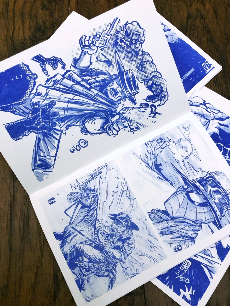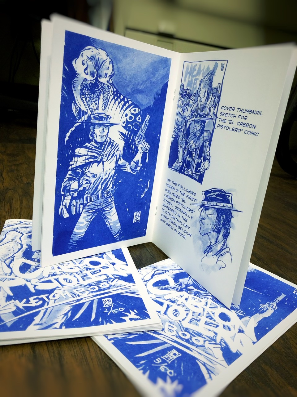 Contains early sketches and concepts for El Cabrón Pistolero and the original 6 page comic that was published in 2009 in a comic anthology from Belgium.