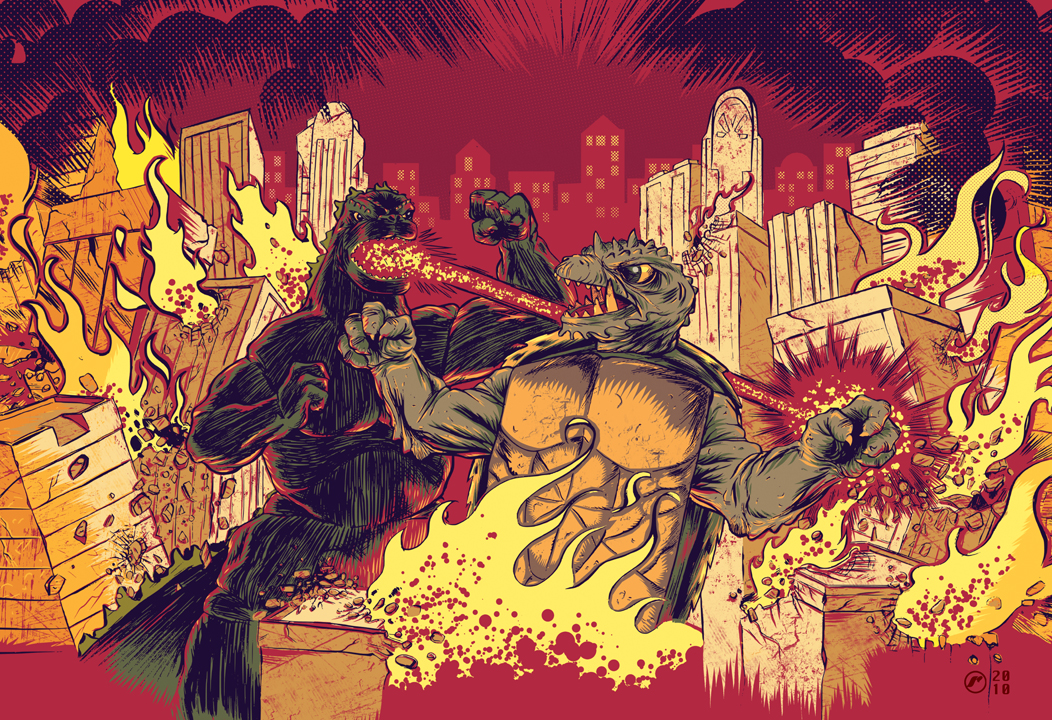 Godzilla vs Gamera in an all out, knock down, building destroying, brawl.